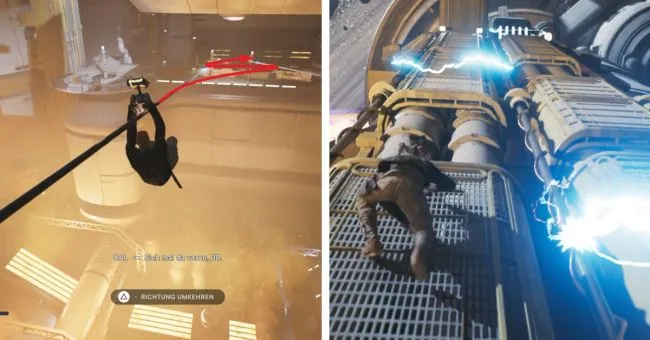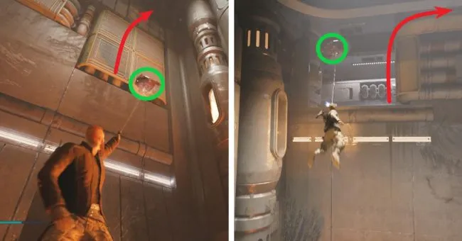 Теперь снова перепрыгните через молнию или проскочите под ней, затем перепрыгните к летающему дроиду на следующей горке и заберитесь по стойкам слева. Здесь Вы убьете следующего дроида B1, после чего зацепитесь за следующего летающего дроида своим тросом для лазания и отсюда прыгайте вверх по противоположным стенам, многократно перепрыгивая. Вам нужно будет хорошо рассчитать время, чтобы избежать теплового излучения. Поскольку вы не сможете сразу упасть с этих стен, вам следует подождать некоторое время, прежде чем продолжить.