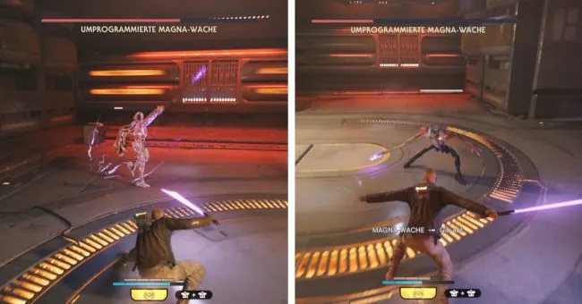 Если противник атакует с многократным разворотом, следует не блокировать, а отступать. Это действие быстро прорвет вашу оборону. В этом случае лучше держать дистанцию и стараться не попасть под удар. Это прекрасная возможность выстрелить в Стража Магна из бластера и нанести ему урон.