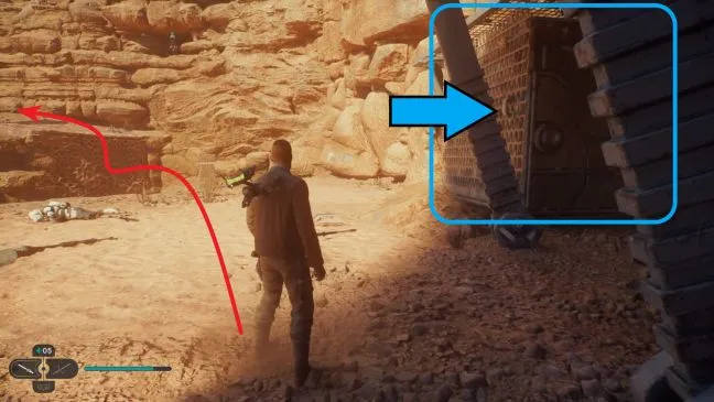 Империя наступает, и вы должны спасти брата Армиаса в Храме джедаев. Следуйте за Меррином на поверхность - дверь наружу можно открыть взрывом Силы - и сохранитесь на некоторое время в точке медитации "База Абахорен". Затем сядьте на спамеля слева, чтобы быстрее пересечь пустыню. Скачите прямо к руинам и пересеките их.