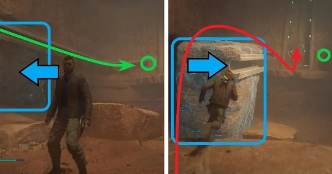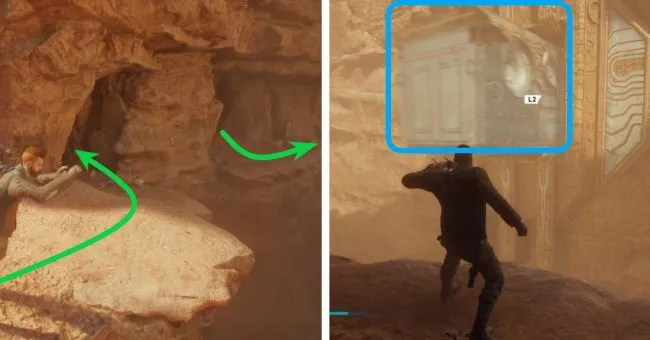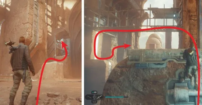 Пробегите дальше, убейте двух разведчиков и держитесь левого верхнего угла пещеры. Здесь используйте Силу, чтобы вытащить ветровой барьер из стены перед собой, затем пробегите по стене справа, чтобы добраться до стоек в нижней части ветрового барьера и перебраться на другую сторону. На другой стороне спрыгните вправо, чтобы с помощью ветра добраться до следующей стены и сделать несколько перебежек по стене.