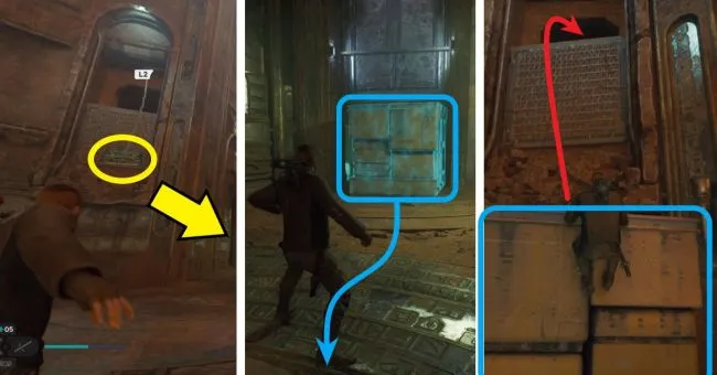 Справа от двери, через которую вы только что вошли, есть несколько блоков, на которые можно запрыгнуть один за другим, чтобы подтянуться по стальным балкам. С помощью альпинистского троса перепрыгните на стойки в нижней части прохода и по ним переберитесь на другую сторону коридора. Спуститесь вниз, пробегите по стене справа, запрыгните на перекладину и перекатитесь на твердую землю.