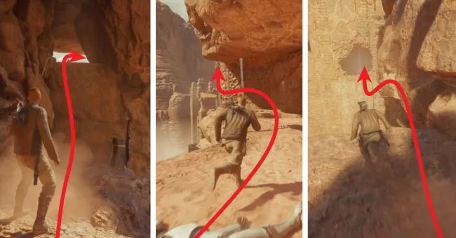 Продолжайте бежать и перепрыгивать через камни. Следите за очередными взрывающимися жуками, которые хотят Вас атаковать. Карабкайтесь по стенам, используя трос для лазания и соответствующие точки крепления, и поднимайтесь вверх, пока не достигнете вершины. Здесь вы откроете короткий путь и попадете в зал.