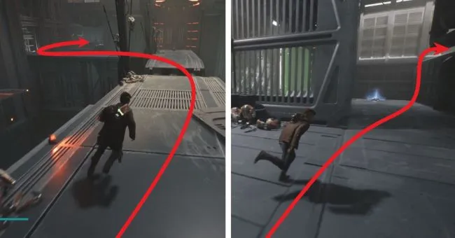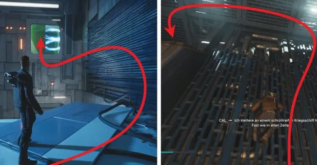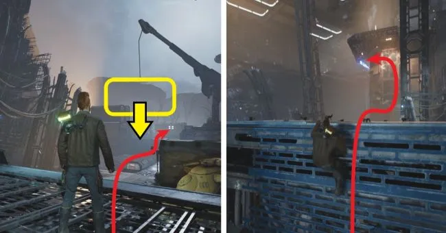 Поднимитесь на башню и на вершине прыгните направо к трубопроводу, где с помощью альпинистского троса перепрыгните на канат, по которому вы скользите. Далее прыгайте на левую веревку, а затем на другую, еще дальше, используя тройной прыжок и свой альпинистский трос. Внизу убейте дроидов и откройте короткий путь.