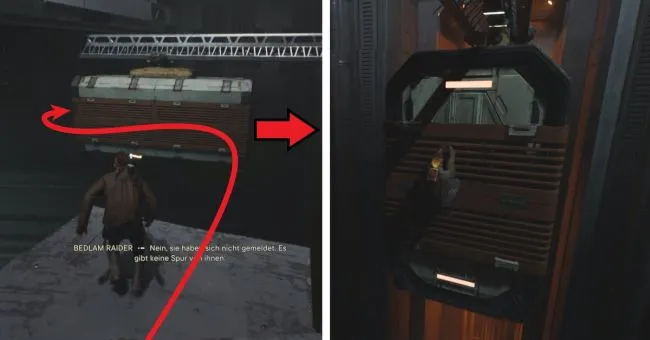 Теперь откройте дверь с помощью BD и перепрыгните на другую сторону. Бегите налево и ждите, пока справа не проедет контейнер. Когда он зайдет за поворот, прыгайте к нему, чтобы перебежать на стену, а оттуда - на платформу сзади слева. Здесь же находится точка опоры для вашего альпинистского троса. Перейдите к терминалу сзади и откройте дверь с помощью Боде.