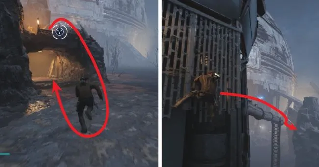 Здесь вы совершаете тройной прыжок, чтобы снова оказаться на твердой земле сзади справа, а затем тройной прыжок влево, где вы забегаете за угол и снова подтягиваетесь к твердой скале. Здесь вы позволите BD1 взломать тросовую пусковую установку, а затем зацепитесь за нее, чтобы перескочить.