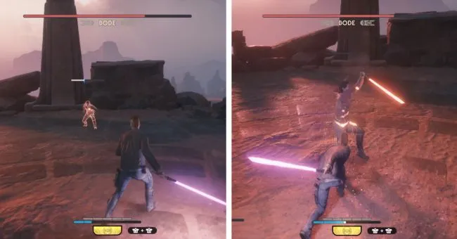 Блокируйте выстрелы из бластера, а также удары светового меча и следуйте за ними. Старайтесь отбрасывать гранаты назад с помощью Силы. Если Боде начнет красную атаку, подпрыгните в воздух и в сторону или сделайте взрыв Силы, который отбросит его назад. Если он поймает вас, то бросит в вас гранату, которая нанесет большой урон.