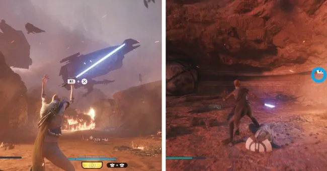 Теперь вы играете за Сира. Нажмите на обе палочки, чтобы создать силовой барьер. Теперь идите вперед и вбейте в штурмовиков немного манер. Управление практически такое же, как и всегда. Вы быстро поймете, насколько Cere мощнее Кэла, и враги просто растают перед вами. Не забудьте также уничтожить ракетную установку, расположенную дальше, сбив ее силовым магнитом.