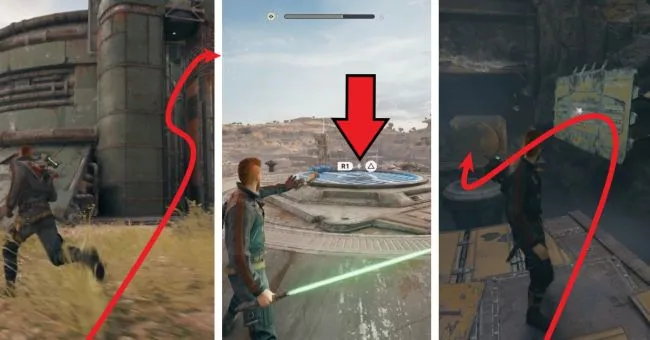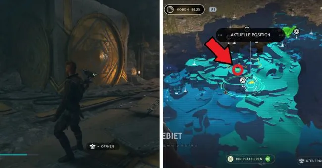 В южной части Кобоха находится большой зеленый бункер, на крышу которого можно попасть, прыгая по стенам. Здесь вы расправитесь с дроидами и с помощью Силы поднимите решетку в центре. Спуститесь вниз, используя уже приобретенные навыки джедая. Для этого придется много прыгать, карабкаться и карабкаться. Вы также можете открыть главные ворота в бункер изнутри. В самом низу с помощью Силы поднимите большую экскаваторную лопату справа, подтянитесь к ней с помощью троса для лазания, перепрыгните через стену и переберитесь на другую сторону, где находится вход в Палату Смелости.