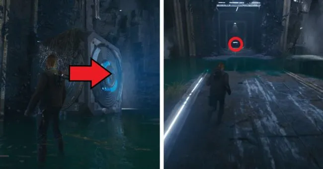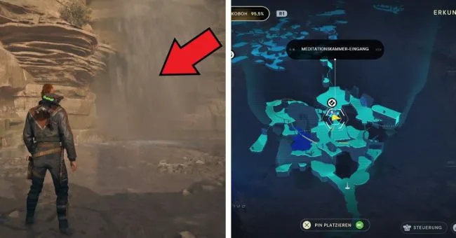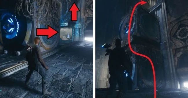 Вы пройдете мимо этой камеры джедаев, когда будете проделывать путь от аванпоста до лесного комплекса в игре. Следующая точка медитации, до которой можно добраться с помощью быстрого перемещения, - "подъем в гору". Пересеките здесь зеленые лазерные барьеры, перепрыгните на водяную платформу, расположенную дальше, и бегите за водопад, где вы попадете в "Камеру отстранения".