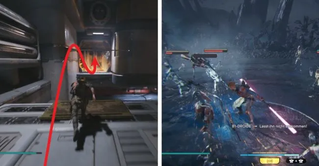 Прыгнув на перекладину перед ним, Вы попадете в туннель, где нужно дождаться, пока не закончится выброс горячего пара, а затем повернуть направо, где находится силовая трещина. Задача, которая Вас здесь ожидает, довольно проста, хотя и объемна: Вы должны победить целых 150 боевых дроидов B1, используя выбранный Вами стиль боя. Поскольку он особенно удобен для одновременной борьбы с большим количеством врагов, мы рекомендуем использовать стиль двойного клинка.