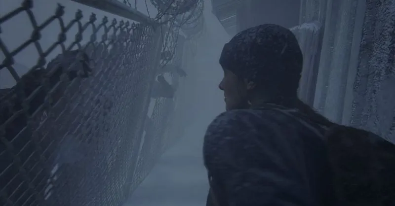 Бегите, пока не достигнете полузанесенного снегом озера. Пробегите через мелкое озеро, пока на другой стороне снова не начнется подъем. Затем заберитесь на крышу автомобиля, чтобы перебраться через забор. За ним вы продолжаете путь с крыши автомобиля на крышу автомобиля и на контейнеры грузовика. Наконец, перепрыгните через высокие ворота во двор и протиснитесь к Эбби через щель в заборе. Пробирайтесь дальше, пока не дойдете до забора из проволочной сетки, который грозит опрокинуться под напором зараженных. Вам нужно пробраться за забор вдоль стены.