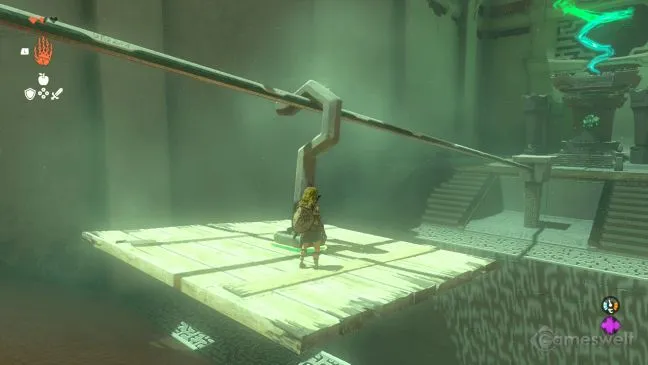 Ваша задача в этом святилище проста. Нажмите кнопку L и направление на правом аналоговом стике, чтобы выбрать силу Ultra-Hand и использовать ее для поднятия каменных плит. Теперь с помощью панели управления и правого аналогового стика вы можете перемещать выбранную вами каменную плиту по высоте и положению. Если вы хотите перевернуть ее, удерживайте кнопку R и используйте площадку направлений для поворота объекта.