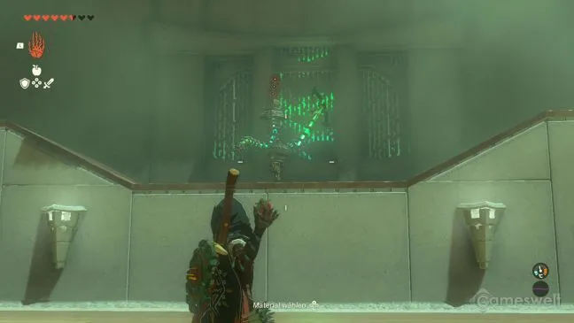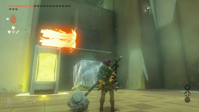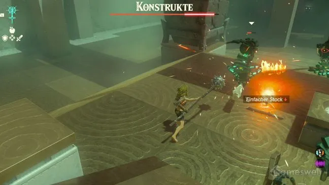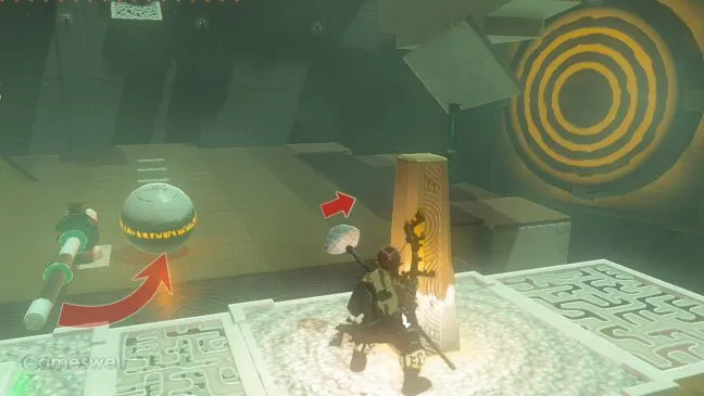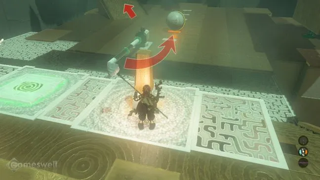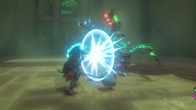 В этом святилище все еще довольно просто. Проберитесь как можно дальше в центр центральной комнаты, а затем пробегите мимо роботов-конструкторов. Они заметят вас и бросятся к Линку. Бросьте в них несколько огненных плодов, чтобы отвлечь их внимание. Затем, используя возможность хаоса, быстро подберите палку и большую сферу утренней звезды на маленькой платформе и соедините их вместе с помощью навыка синтеза. В результате у вас получится мощное оружие с большим радиусом действия.