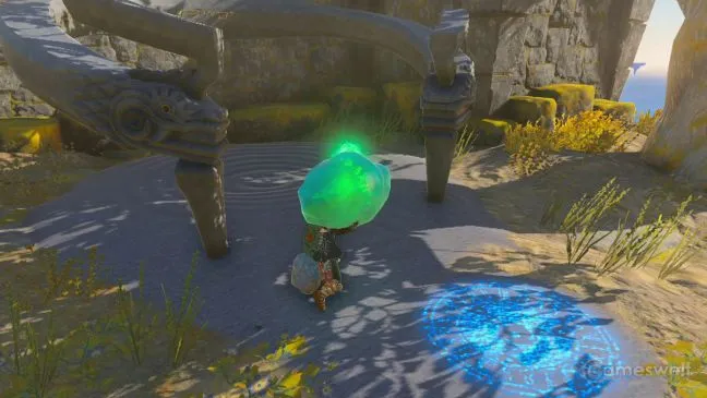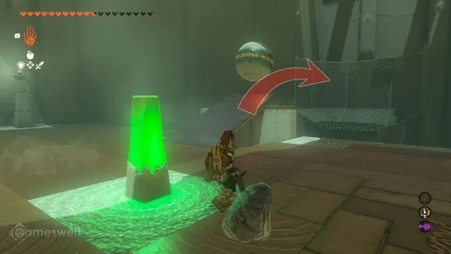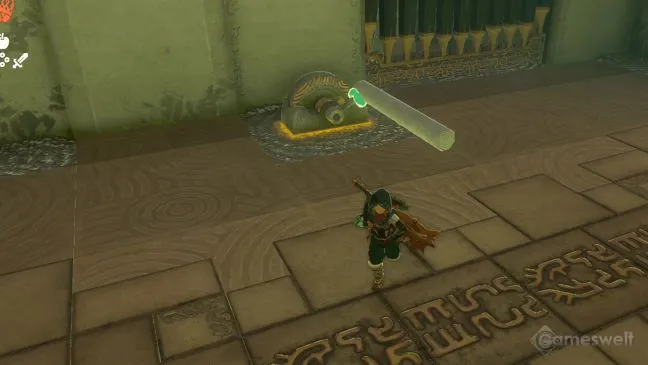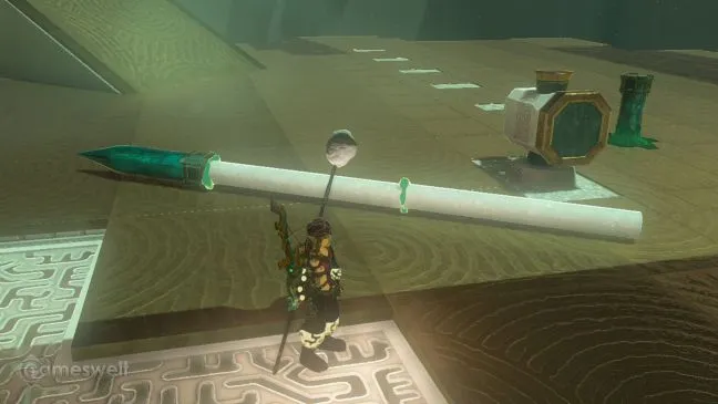 В зоне входа в святилище наступите на ступенчатый переключатель, чтобы мишень повернулась к вам. Затем спуститесь на уровень, по которому катится шар, и возьмите из земли слева зеленый столб Sonau рукой Ultra. Используйте этот столб в качестве основания и приклейте к его концу две длинные тонкие колонны так, чтобы получилась длинная летучая мышь.