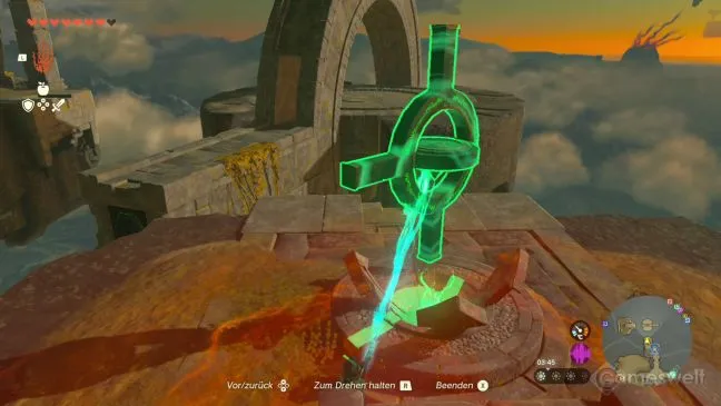 На архипелаге найдите рядом с постаментом конструкцию, имеющую форму круга с двумя короткими столбами (см. наш рисунок). Эта структура является управляющей для каменного острова такой же формы, который плавает перед вами между частями острова. Если воздействовать на объект ультрарукой, то его можно вращать (лучше всего для этого заставить объект вращаться, удерживая кнопку R, а затем использовать курсор для определения направления).
