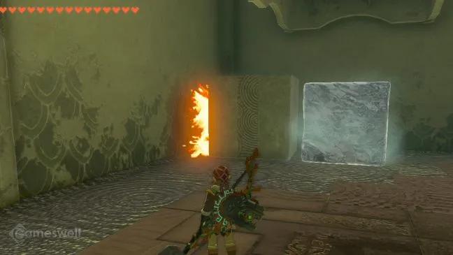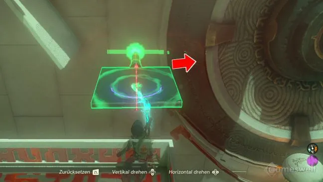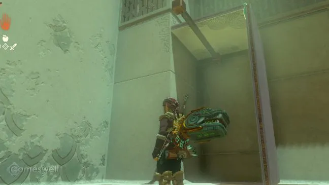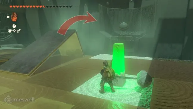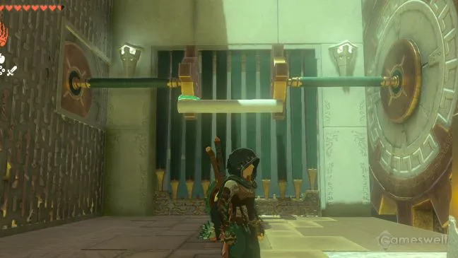 В святилище поместите металлическую пластину на две балки, висящие в стене. Теперь у вас есть платформа, на которую можно попасть, спрыгнув с потолка.