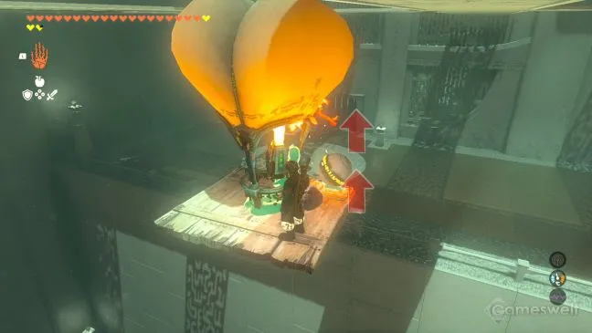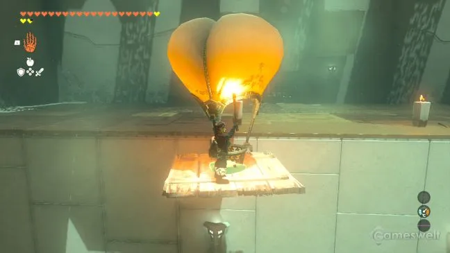 Это святилище посвящено воздушным шарам. Сделайте транспортное средство из воздушного шара и одной из досок с левой стороны и поставьте конструкцию как можно ближе к передней стене. Теперь возьмите факел, лежащий на земле справа, зажгите его на пламени, которое находится рядом, и встаньте с зажженным факелом рядом с воздушным шаром, который вы только что сделали. Таким образом, вы нагреете воздух на воздушном шаре и подниметесь на верхний этаж.