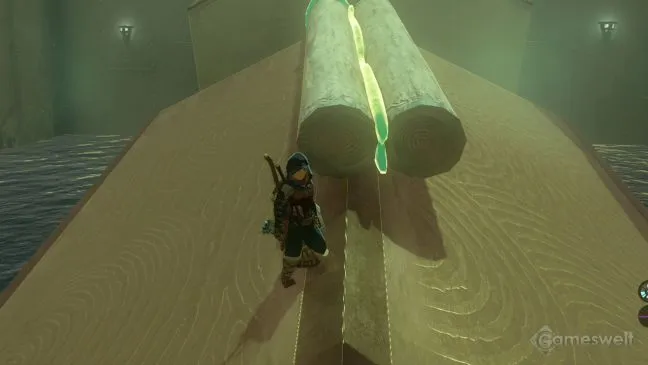 Довольно простое святилище, в котором нужно только научиться сплавлять стволы деревьев вместе и укладывать их так, чтобы по ним можно было забраться наверх. В самом начале возьмите ствол дерева, лежащий рядом, своей ультрарукой и положите его под углом на стену внутри одного из углублений, чтобы можно было забраться наверх. Для следующей формы крыши склейте два ствола деревьев вместе по длине так, чтобы промежуток между стволами располагался точно на вершине формы крыши. Можно также добавить первый ствол дерева, чтобы сделать конструкцию длиннее.