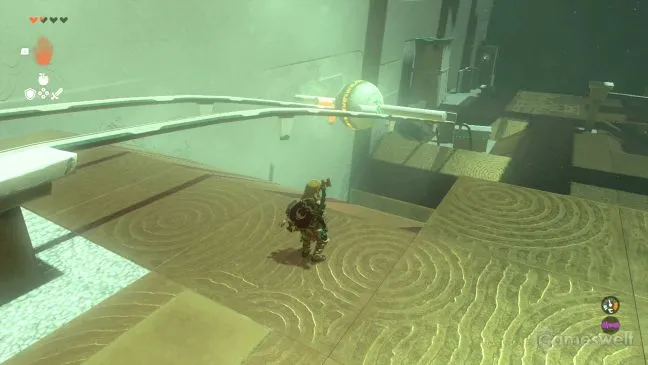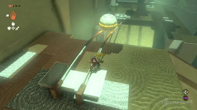 Это святилище - одно из самых сложных. Когда вы войдете в святилище, то увидите большое углубление перед дверью справа. Вам нужно положить туда шар, который откроет дверь. Этот шар находится на другой стороне ущелья на конструкции, расположенной намного выше уровня головы. Перепрыгните на одну из двух высоких лестниц со скольжением и поднимитесь к сфере. С помощью ультраруки поместите этот шар у задней стены на рельсы. Дайте шару скатиться по рельсам и перепрыгните за ним с помощью скольжения.
