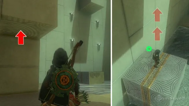Теперь освободите один куб и отнесите его в среднюю область между двумя углублениями по бокам. Там поставьте куб на более высокий уровень и с помощью прыжка через потолок переберитесь на вершину куба. Это приведет вас в следующую комнату святилища.