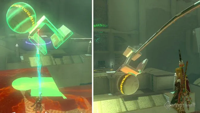 Ваша задача в святилище - боевое упражнение. Вам нужно прицелиться в робота-конструктора из лука и стрел, прыгая или летая. Если вы используете лук в полете, то время замедляется, и вы можете спокойно прицелиться. Это святилище можно разгадать только с помощью этой техники.