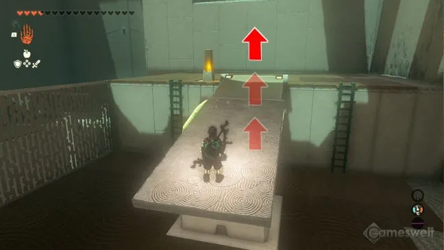 В результате центр тяжести оказывается значительно левее, так что даже три тяжелых блока с правой стороны не могут удержать рампу. Если сдвинуть Link в сторону от левой стороны (к правой стороне рампы), она наклоняется, и вы поднимаетесь на последний уровень, где достигаете места назначения святилища.