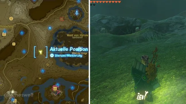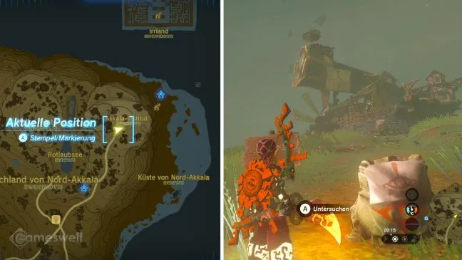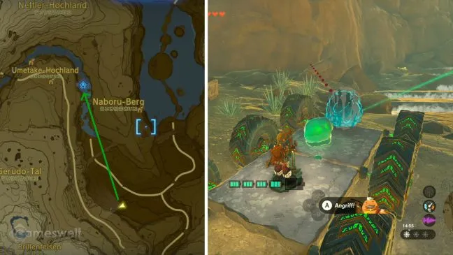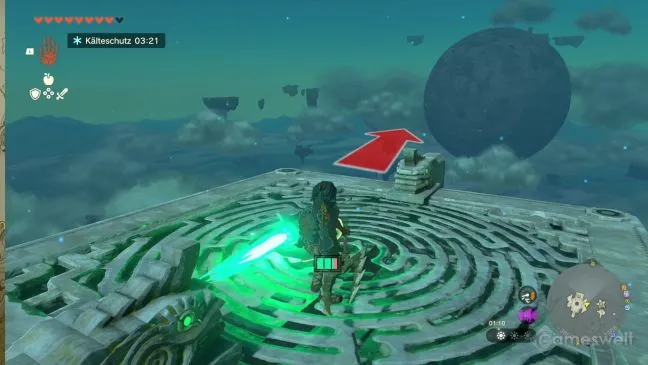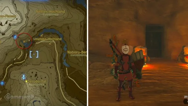 Добраться до этого святилища можно, поднявшись из башни на плато Герудо в небо и пролетев на север. В результате вы окажетесь на самом нижнем уровне Северного архипелага Герудо. Воспользуйтесь ракетами на плавучей платформе, чтобы переместиться сначала вверх, а затем еще немного на северо-северо-восток. Это приведет вас к большой сфере, называемой островом Штернблик, на который нужно забраться, чтобы найти вход. Это очень весело, потому что на такой высоте сила тяжести меньше. Поэтому падение при прыжке происходит медленнее.