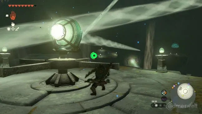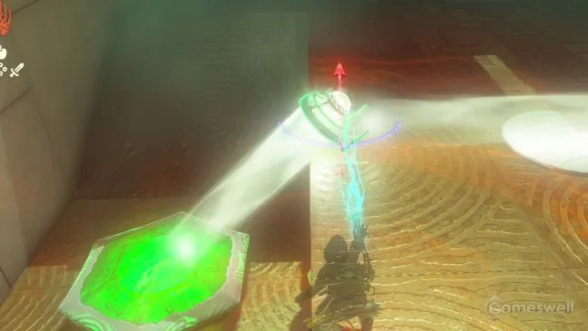 Оказавшись на вершине, вы можете выбрать один из двух путей. Один из них приведет вас к сундуку с сокровищами, внутри которого находится большая энергетическая сфера Сонау, а другой - к месту назначения святилища. Какой бы путь вы ни выбрали, сначала разберитесь с роботами-конструкторами в следующей камере. Затем используйте три имеющихся зеркала, чтобы создать отвлекающий свет вокруг камня-блокиратора.
