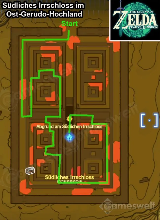 Чтобы добраться до этого святилища, необходимо найти путь через Южный лабиринт, который находится в горном проходе между пустыней Герудо и горой Моргана. Лабиринт наполнен миазмами, поэтому для безопасности желательно иметь при себе лечебную еду или компоненты для передвижного средства. Кроме того, ночью в этой местности становится очень холодно. К этому тоже нужно быть готовым.