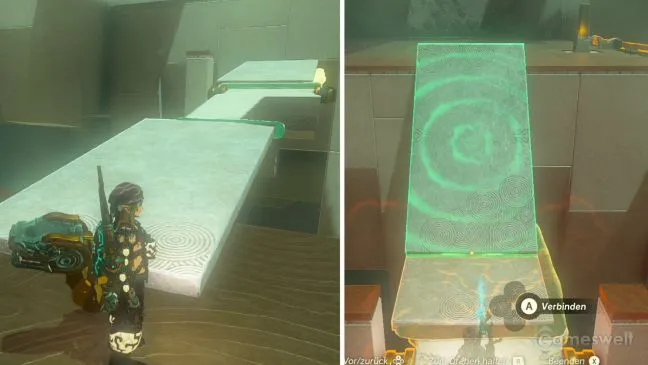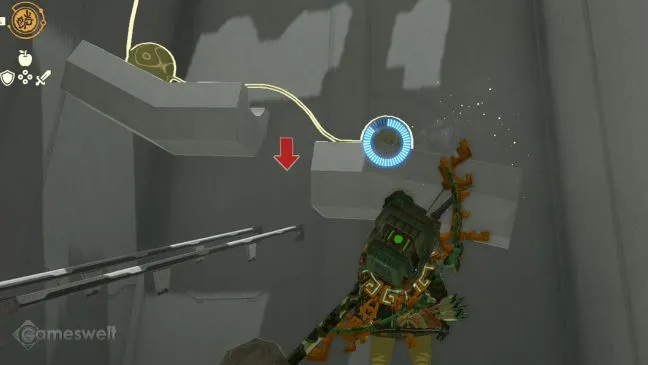 В начале святилища на шарнире крепится деталь моста. Очевидно, что он недостаточно тяжелый, чтобы его можно было столкнуть вниз, так как он направлен вверх под углом. С помощью ультраруки возьмите пластину, которая находится на стене справа, и прикрепите ее к верхней части моста. Под действием возросшего веса мост упадет, а благодаря удлиненной поверхности он перейдет на другую сторону, и вы сможете пройти по нему.