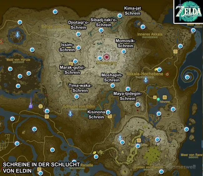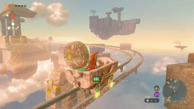 Добраться до этого святилища можно, если выстрелить в небо с башни в ущелье Элдин, а затем приземлиться прямо на первый остров под вами. На острове сделайте тележку с приводом от вентилятора, а также прикрепите к тележке аккумулятор, который также валяется рядом, чтобы у Вас была энергия для поездки на более длительное время. По рельсам вы доберетесь до следующего небесного острова. По одному из толстых корней заберитесь на антресоль между нижним и верхним уровнями. В зависимости от того, где вы окажетесь, вам, возможно, придется разбить мечом несколько тонких корней деревьев, чтобы попасть во внутреннюю зону. Возьмите с собой содержимое сундука с сокровищами. В нем находится ценный знак Воли Мудрого. Сундук находится на антресольном этаже острова. Теперь можно запрыгнуть наверх, где построить следующий грузовик с приводом и отправиться на следующий остров.