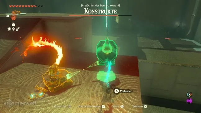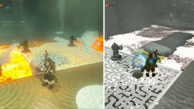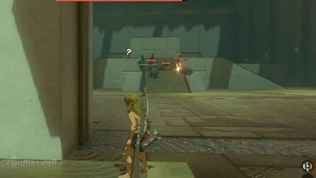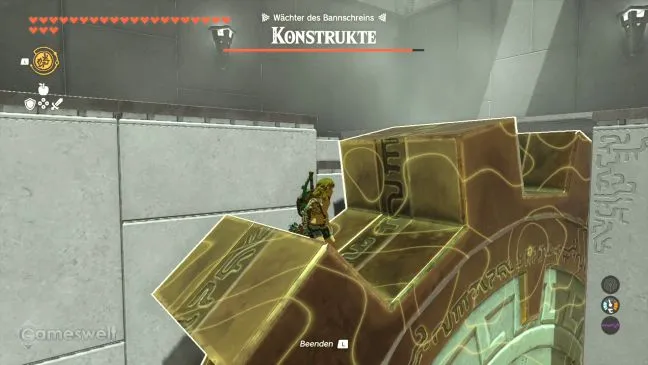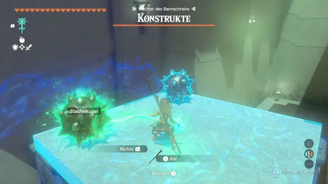 За одной из небольших стен на восточной стороне святилища находится метатель льда. Как только вы возьмете щит с одного из конструктов, вам следует присоединить к нему с помощью синтеза метатель льда. Так вы сможете оставаться пассивным и при этом замораживать врагов. Таким образом, на платформе остались только последние конструкты.