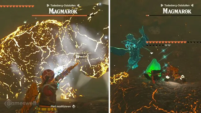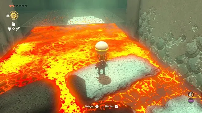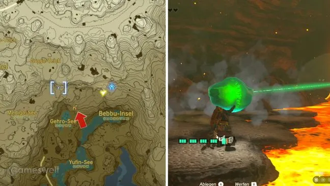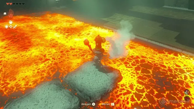 На другой стороне Вам придется использовать каменный молот или громовой цветок, чтобы пробиться через мягкую породу. В комнате позади вас находятся два гидранта. Расположите их так, как показано на нашем рисунке, - так, чтобы они стояли друг за другом, но распыляли воду в противоположных направлениях в поток лавы. Таким образом, с обеих сторон образуются плоты, которые плывут по течению.