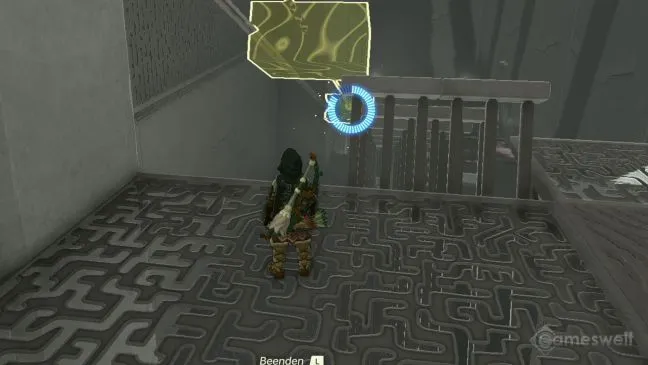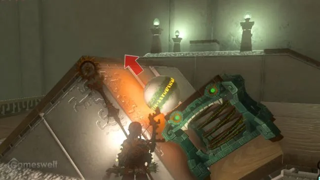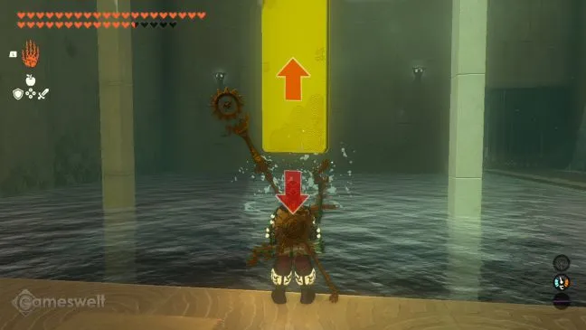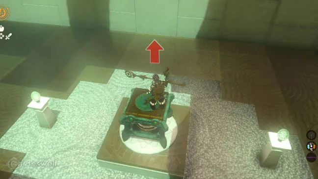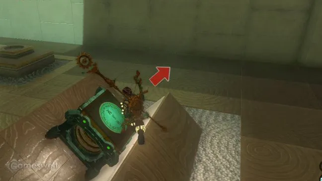 Сам Линк поднимается на более высокий уровень в начале водного бассейна по лестнице и, таким образом, может перебежать на этот берег. На безопасном берегу встаньте на маленькую ступеньку, чтобы открыть следующую дверь, и толкните шар во входном коридоре в углубление. Это приведет вас к месту назначения святилища.