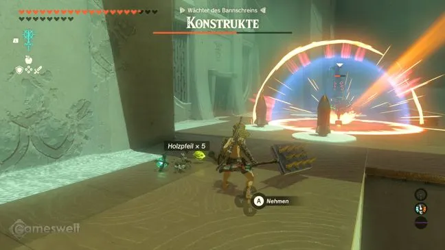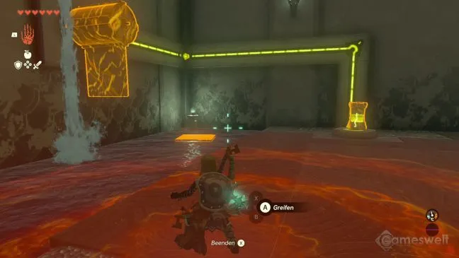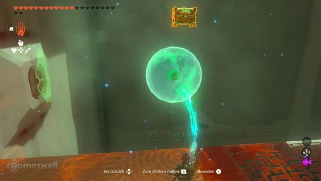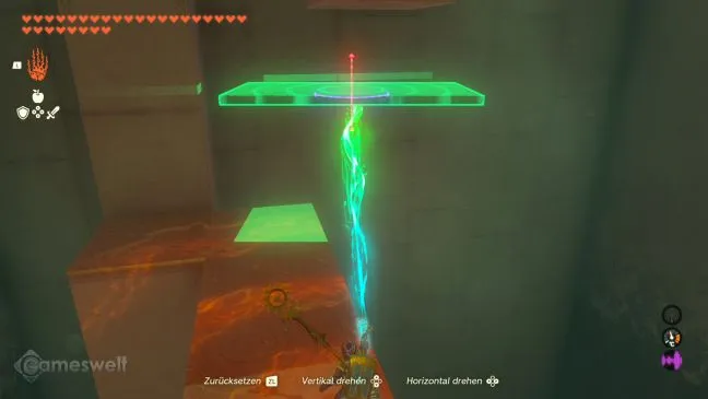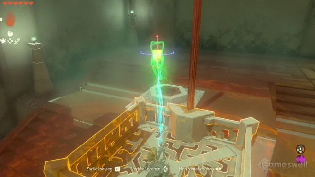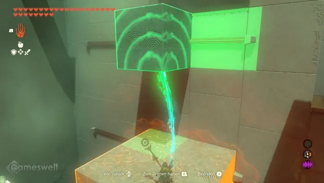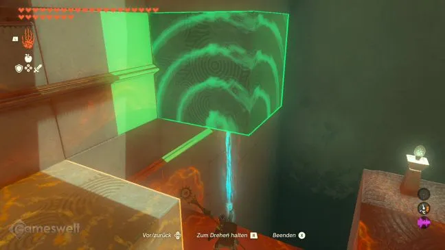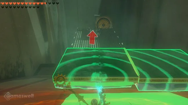 В этом святилище Вы найдете несколько каменных кубов и блоков на рельсах. Теперь Вам нужно переместить их по рельсам так, чтобы попасть на более высокий уровень. Это довольно просто. Сначала переместите правый куб так, чтобы он оказался под Вами и Вы могли достать его, запрыгнув на потолок.