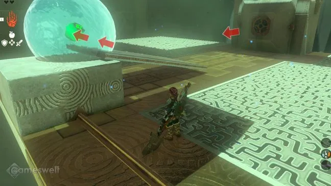 В отличие от обычных святилищ, где нужно добыть кристалл, в этом святилище нужно выполнить задание. Поэтому на входе нужно взять несколько ледяных фруктов и бросить их в бассейн с водой, чтобы образовались льдины.