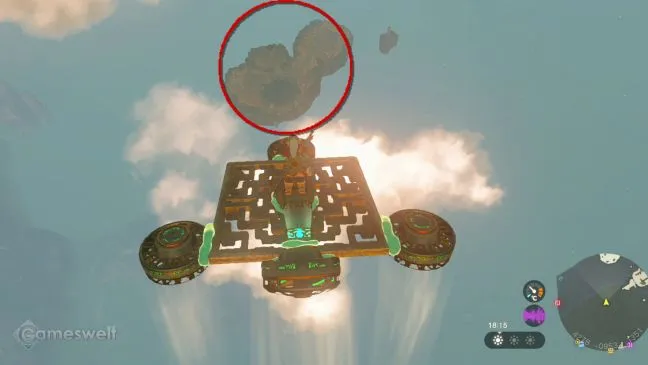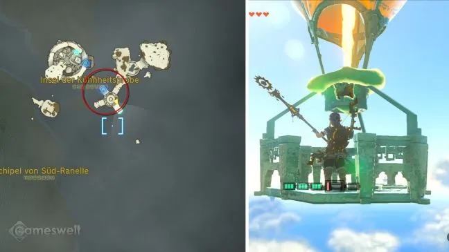 Используйте башню на пике Ранель, чтобы стрелять в облака. Если вы поплывете на север, то попадете на небольшой остров в небе, где находятся два летательных аппарата. Используйте задний летательный аппарат (не планер, а платформу с четырьмя вентиляторами), чтобы пролететь на восток и набрать большую высоту. Это приведет Вас к острову с небольшим бассейном с водой.