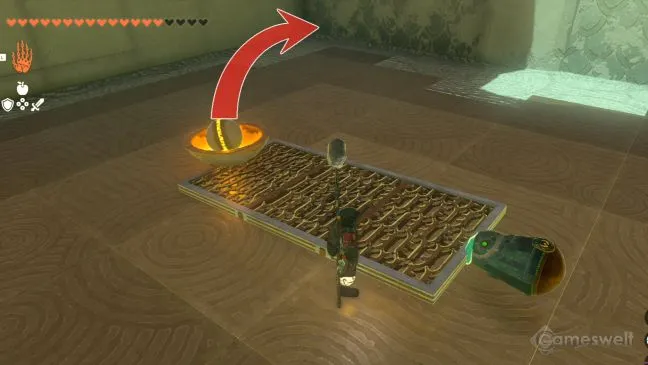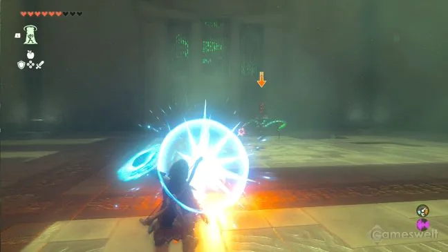 Как и в случае со святилищами боевых техник, для овладения этим святилищем необходимо точно следовать инструкциям. В данном случае необходимо парировать атаки. Для этого необходимо точно рассчитать время. Сначала нужно парировать огненные стрелы с расстояния. Поднимите щит (кнопка ZL) и ждите, когда в вас полетит огненная стрела. В тот момент, когда она угрожает попасть в Вас, нажмите кнопку A, чтобы отбросить огненную стрелу щитом в сторону отправителя.
