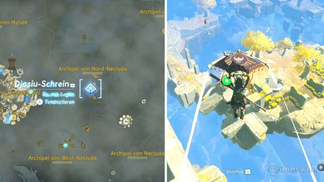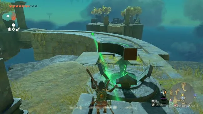 Обследуйте пещеру, пока не дойдете до пещерного озера с небольшим островком, торчащим посередине. Там через щель уже можно увидеть святилище. Чтобы добраться до него, нужно обогнуть остров, пока не найдете мягкую скалу на южной стороне озера, которую можно взорвать с берега, бросив громовые цветы. На этом все, просто войдите в святилище и заберите свою награду.