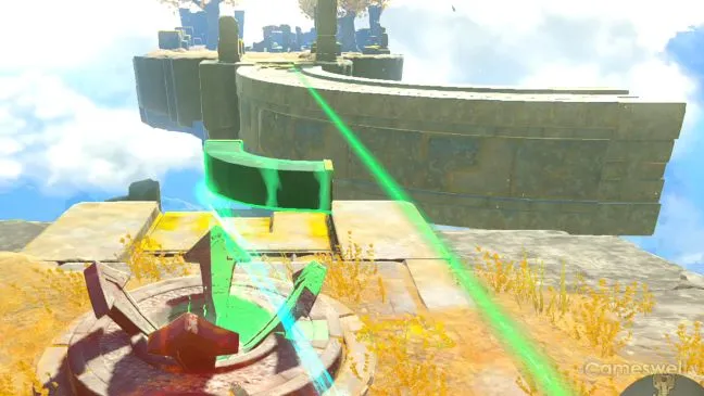 Поверните мост так, чтобы образовалось соединение между островом слева и островом перед вами (тем, на который направлен зеленый лазер). Затем перейдите на часть острова слева и по мосту переберитесь на задний остров, где находится кристалл.