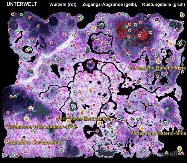 На следующей карте мы даем обзор подземного мира Хайрула со всеми корнями и доспехами, которые можно найти. Оранжевыми точками обозначены пропасти, через которые можно попасть в подземный мир.