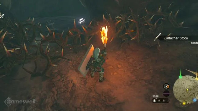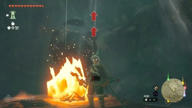 Наверху сначала пересеките проход перед собой, зажгите колючки, чтобы пройти дальше, и застрелите монстра Mayoi на стене хорошим выстрелом из лука, чтобы потом не возвращаться за ним. Продолжайте двигаться по пещере в противоположном направлении и немного поднимитесь по стенам, чтобы попасть в следующий проход.