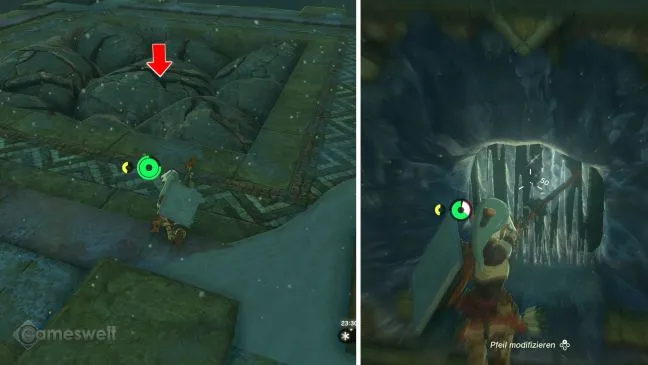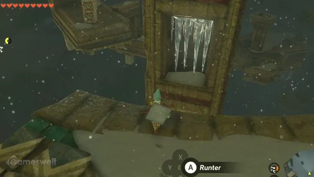 Немного позже Вы наткнетесь на островное образование, где на верхней стороне левого острова Вы увидите отверстие, закрытое мягкой породой. Пробейте скалу молотком или, если нужно, саперным дротиком - только не стойте слишком близко к ней, иначе Вас сбросит вниз. Под ним находится батут. Используйте его, чтобы подпрыгнуть и повернуть направо (на северо-восток). Вы обнаружите вход на другой остров, который загорожен сосульками. Чтобы попасть в них стрелами, нужно подплыть поближе. Но если натянуть лук во время прыжка, то он переключится в режим замедленной съемки, так что у Вас будет достаточно времени, чтобы прицелиться и сбить несколько сосулек, чтобы создать проход. Через него вы попадете внутрь и сможете взять из сундука 10 деревянных стрел.