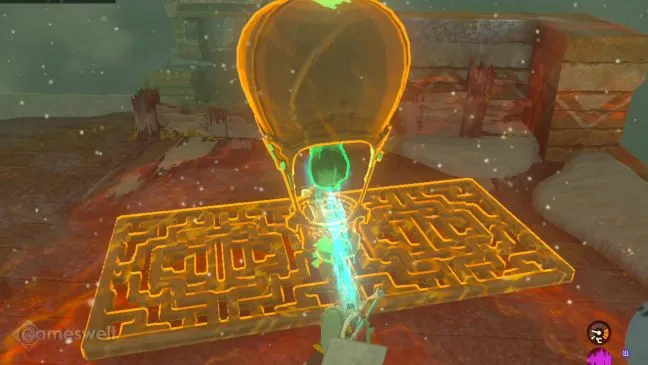 Неподалеку светится зеленый хвост святилища (святилище Майя-Умкиза: Точка прыжка). Это ваш временный пункт назначения, до которого вы доберетесь с помощью паруса-батута плавучего корабля. Просто запрыгните на натянутый парус и перекувырнитесь через него.