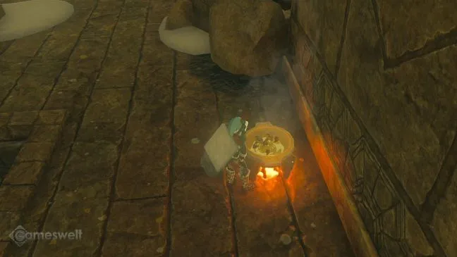 Если вы хотите продолжить путь, то вам нужно вернуться к предыдущему батуту, а затем продолжить путь на юго-запад, к другой ледяной поверхности, под которой находится еще один батут. Это первый из трех батутов подряд. Они приведут вас к промежуточной станции с двумя деревянными ящиками и камином, на котором можно что-то приготовить. В бассейне рядом с ним плавают форели-лягушки. Возьмите их с собой, они пригодятся вам позже в другой зоне.