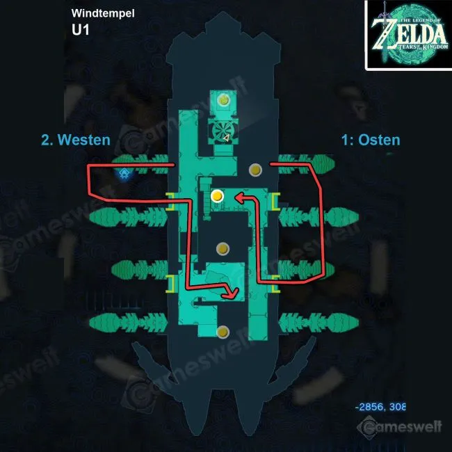 Можно открыть обе двери, но для понимания принципа задания в этом храме сначала нужна только западная дверь. За западной дверью вы найдете большую турбину. Поговорите с Тулином, чтобы он запустил турбину сильным порывом ветра.