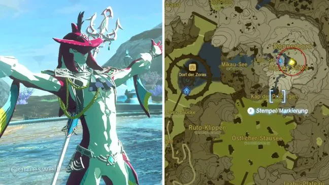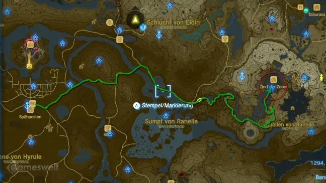Несмотря на то, что теоретически вы можете выбирать порядок посещения храмов, мы рекомендуем храм воды в качестве второй станции. Чтобы начать выполнение связанных с ним квестов, необходимо отправиться в Ранелль, деревню зоров. Это водное поселение находится на востоке Хайрула. Отправляясь в путь с поста разведчика, просто следуйте по дорогам, которые мы указали на нашей карте.