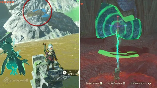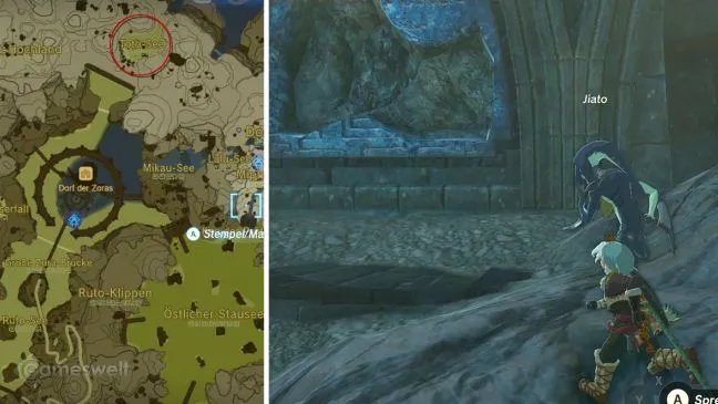 С другой стороны, для вас это не проблема. Посмотрите вправо от позиции Джайто на краю озера на кучу грязи, под которой прячется что-то плоское. Это и есть то, что вы ищете, нужно только освободить его от грязи с помощью водного фрукта или голубого желе из слизи, поднять ультрарукой и принести ему, вставив осколок камня в разрушенную скрижаль.