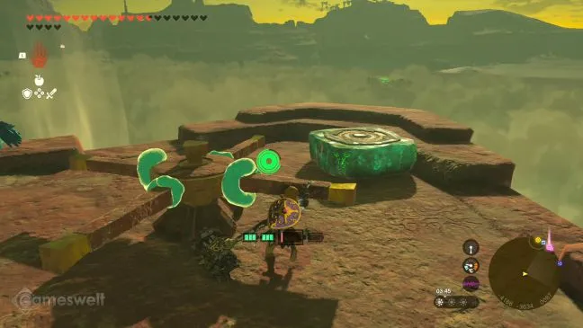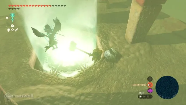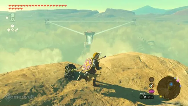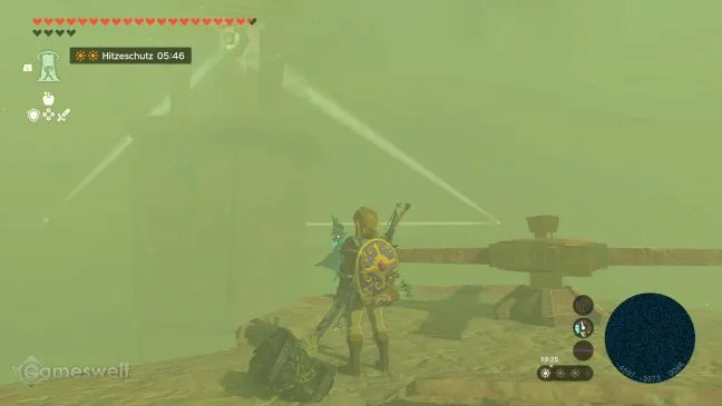 Таким образом, вы приводите зеркало этой башни в такое положение, что свет снова перенаправляется. Теперь луч света образует треугольник, в центре которого что-то вырывается из земли. Прежде чем идти туда, можно посетить святилище в нескольких метрах к востоку (святилище Иразак). Ничего особенного там делать не надо, просто поднять парусный прицел. Поэтому стоит отвлечься. После этого поспешите прямо в центр светлого треугольника, образовавшегося к югу от города Герудо.