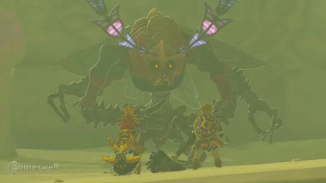 Гигантская моль - королева Гибдо - встречает вас в бою. Она обладает теми же сильными и слабыми сторонами, что и ее подчиненные Гибдо, поэтому она неуязвима, пока на ней броня Гибдо. Однако ее можно легко разрушить, если использовать силу молнии Риджу. Поэтому поговорите с Риджу, дождитесь, пока желтая рамка загородит королеву Гибдо, а затем выпустите стрелу в гигантского мотылька.